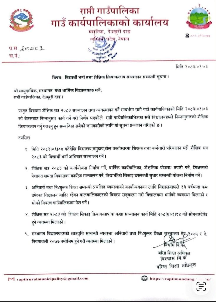 राप्ती गाउँपालिकाद्वारा विद्यार्थी भर्ना अभियान र शैक्षिक गतिविधि सञ्चालनबारे सूचना जारी